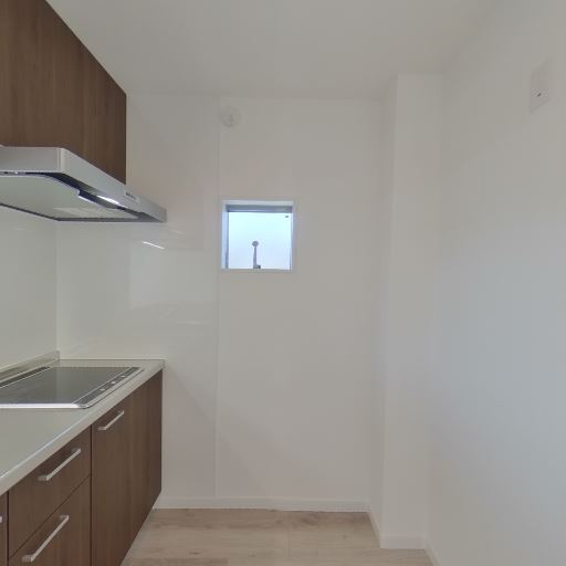 小窓があり換気の補助になりそう(確度72%):キッチン奥側の壁面に小窓があり、採光や換気の補助として機能しそう。