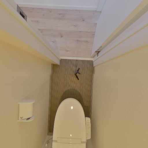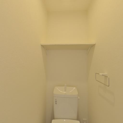 上部に収納棚がある(確度94%):トイレ背面の上部に棚板が1枚設置されており、トイレットペーパーや掃除用品を置ける収納スペースがある。