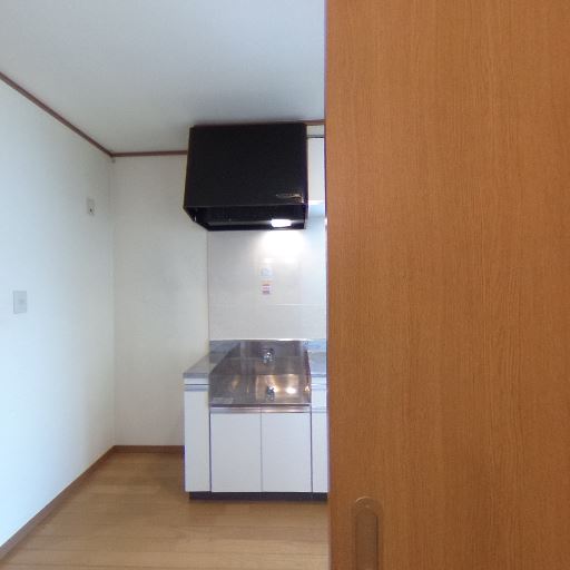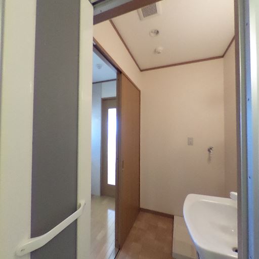 • キッチンが近接(確度80%):引き戸の先にシンクとレンジフードが見え、洗面所のすぐ横がキッチンになっている。