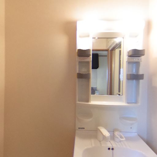 • 独立洗面台あり(確度90%):ミラー付きの独立洗面台が設置されている。収納ポケットや照明も確認できる。
