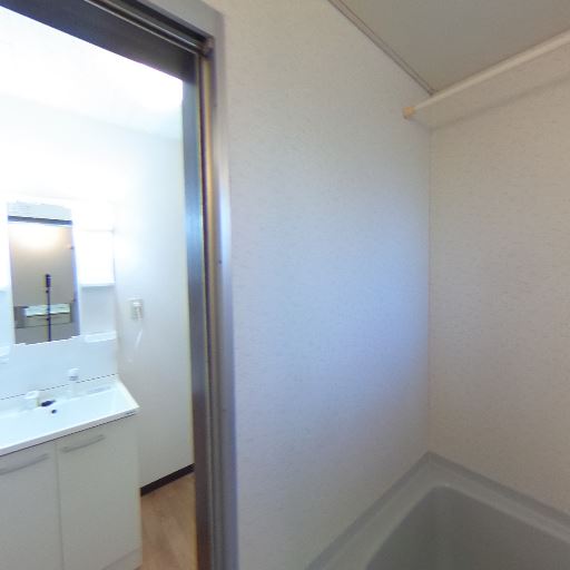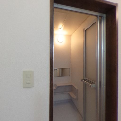 独立洗面台が隣接(確度74%):引き戸の外に独立洗面台が見え、脱衣所と浴室が分かれている。