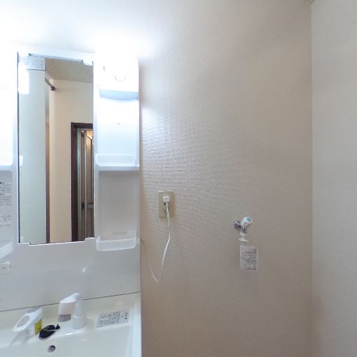 洗濯機置き場あり(確度82%):給水栓と排水口が壁面に見え、床の端にスペースが確保されている。