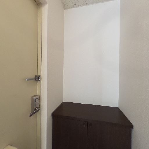 玄関にシューズボックスあり(確度86%):玄関ドア横に高さのあるダークブラウンのシューズボックスが設置されている。