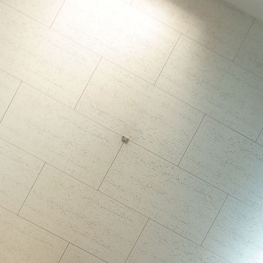 天井照明と天井材の状態(確度70%):天井中央付近に点灯中の照明があり、天井材は白色で大きな汚れは見えない。