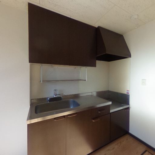 コンパクトなキッチン(確度77%):上部吊戸棚とレンジフード付きの単身向けサイズのキッチン。作業スペースはやや狭め。