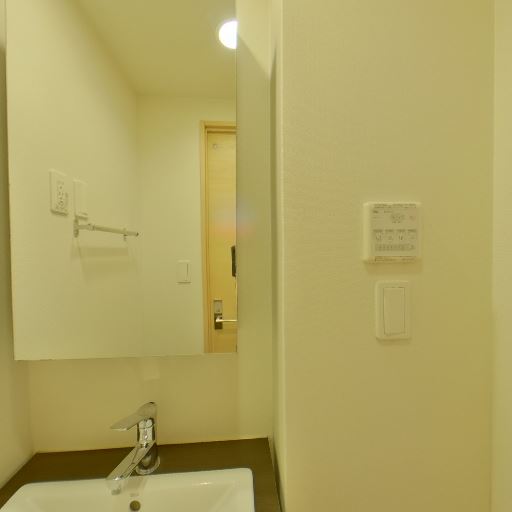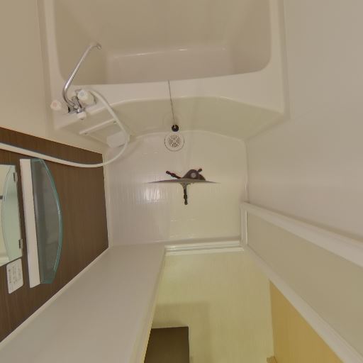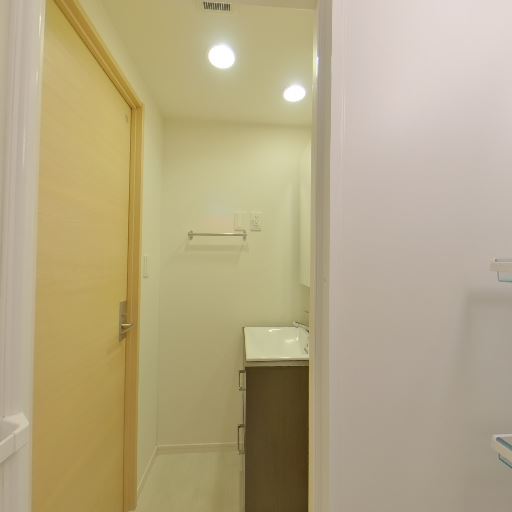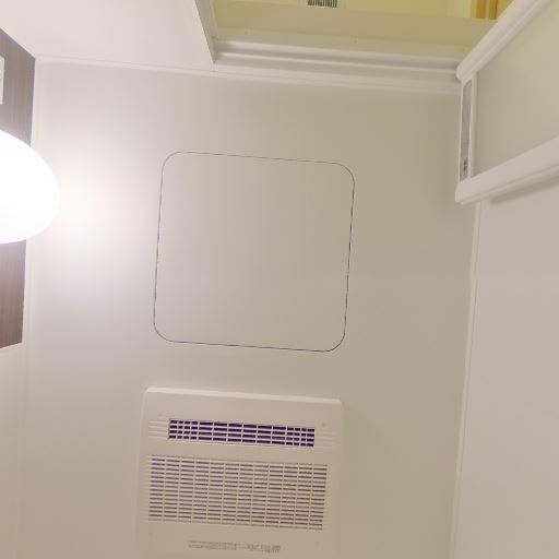 浴室乾燥または換気設備がありそう(確度78%):浴室天井付近に換気・乾燥機らしき設備が見え、洗面側壁面にも操作パネルがあるため、浴室換気乾燥機が備わっている可能性が高い。