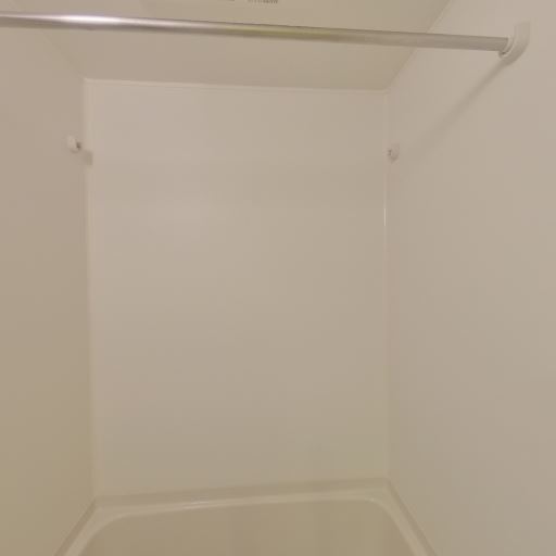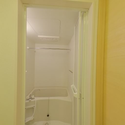 浴室乾燥・物干しに使えそうなバー付き(確度91%):浴室内の上部に物干しバーが設置されており、洗濯物の部屋干し補助や浴室乾燥利用を想定した設備に見える。