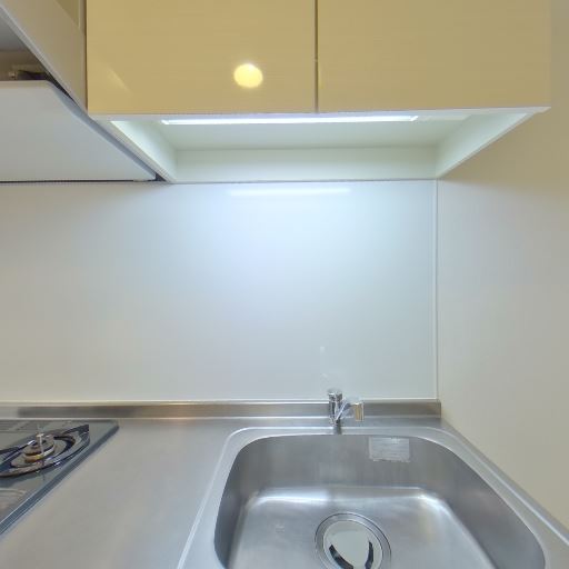 コンパクトながら機能的なキッチン(確度93%):シンクと2口コンロが近接して配置されており、限られたスペースでも調理・洗い物の動線が短くまとまっている。上部収納も設けられている。