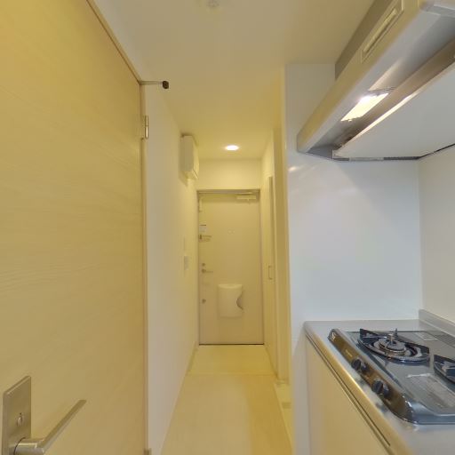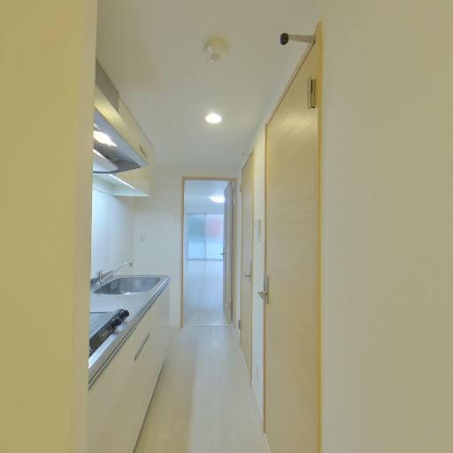 キッチンが廊下側にまとまっていて使いやすそう(確度83%):廊下左手にシンクとコンロを備えたコンパクトなキッチンが設置されている。動線上にあり、単身者向けとしては機能的に見える。