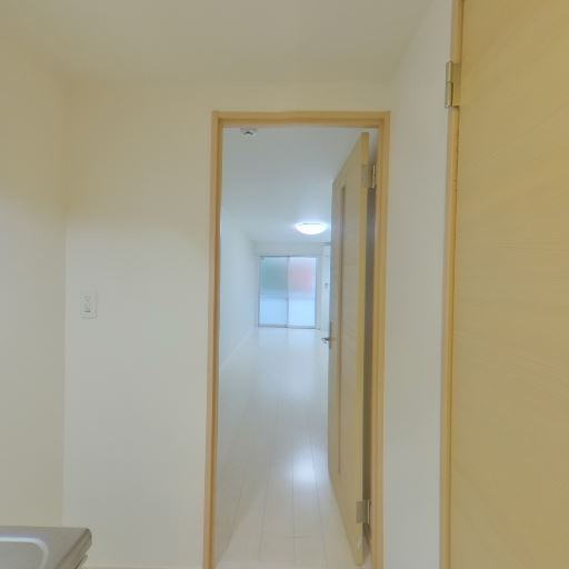 玄関から室内までの見通しが良い(確度88%):玄関ドアから廊下・キッチン・奥の居室方向まで一直線に見通せる細長い間取りに見える。空間全体の把握はしやすい。