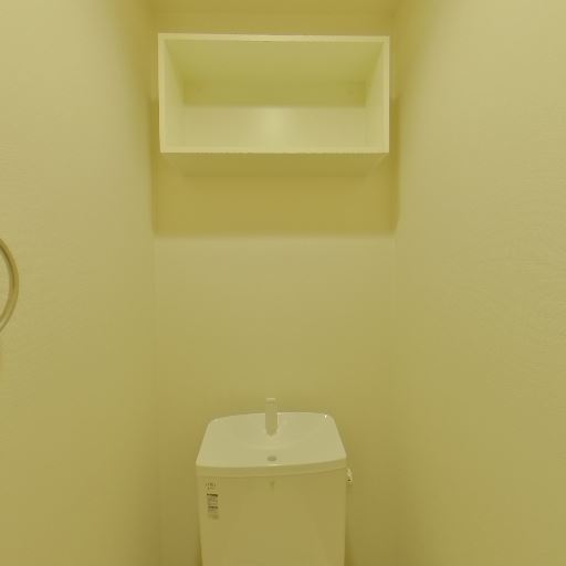 トイレ上部の収納棚がある(確度94%):便器上の壁面にオープンタイプの収納棚が設置されており、トイレットペーパーや掃除用品の置き場として使えそうである。