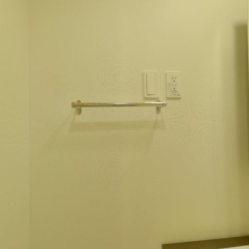 タオル掛けが設置されている(確度95%):洗面スペースの壁面に金属製のタオルバーが設置されている。洗面台の近くにあり、日常動線として使いやすい位置。