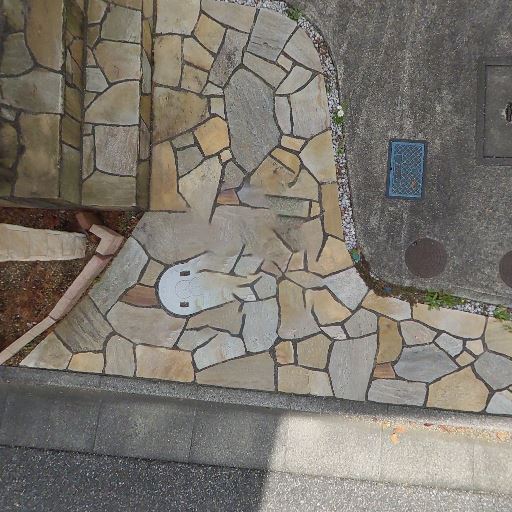 • 玄関まわりはデザイン性がある(確度89%):石貼りの階段・アプローチ、門灯風の照明、植栽があり、玄関周辺は意匠性を意識した外構になっている。