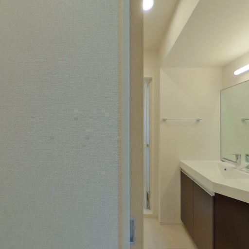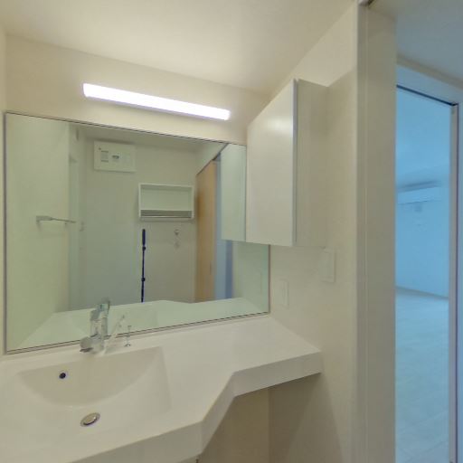• 洗面スペースが新しく清潔感がある(確度90%):洗面台は大型ミラー付きで、カウンターや収納面材も比較的新しく見え、全体として明るく清潔感のある印象を受ける。
