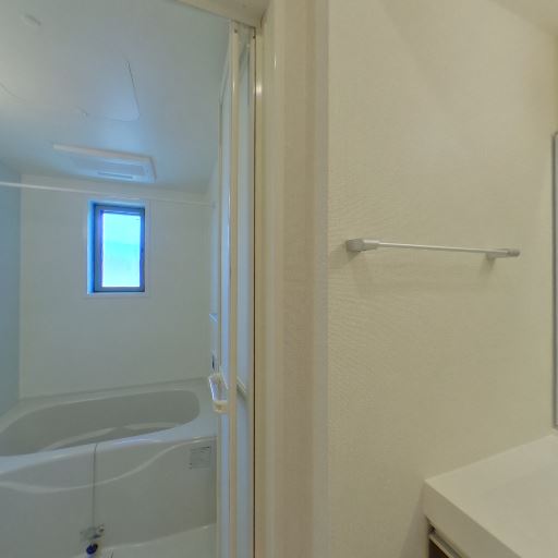 • 全体的に清潔感のある水回り(確度82%):壁・洗面台・浴室まわりに目立つ汚れや大きな傷みは見当たらず、白基調で明るく整った印象を受ける。