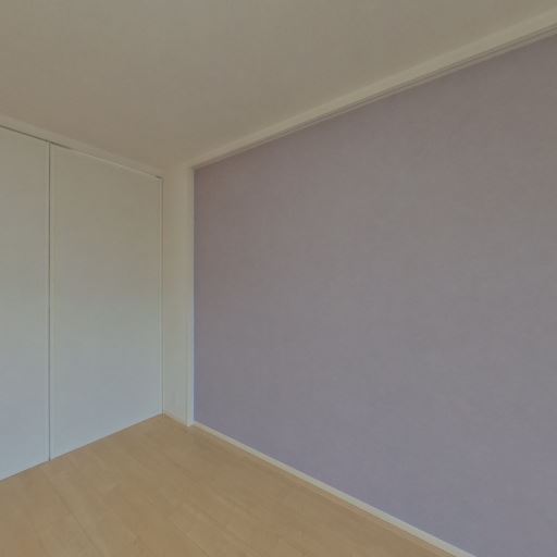 • アクセントクロスで空間に個性がある(確度87%):一面のみ淡い紫系のアクセントクロスが使われており、白基調の室内に変化を与えている。