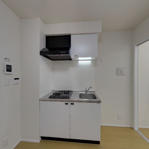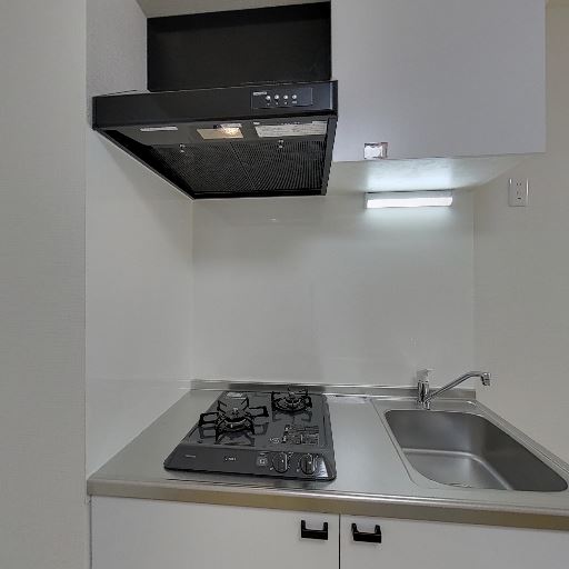 コンパクトなキッチン(確度90%):1口ガスコンロと小型シンクのミニキッチン。換気扇と吊戸棚があり、自炊は軽め向き。