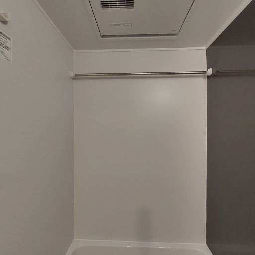 浴室乾燥機・物干しバーあり(確度90%):天井に浴室乾燥機と思われる換気暖房乾燥機と、壁面に物干しバーが設置されている。