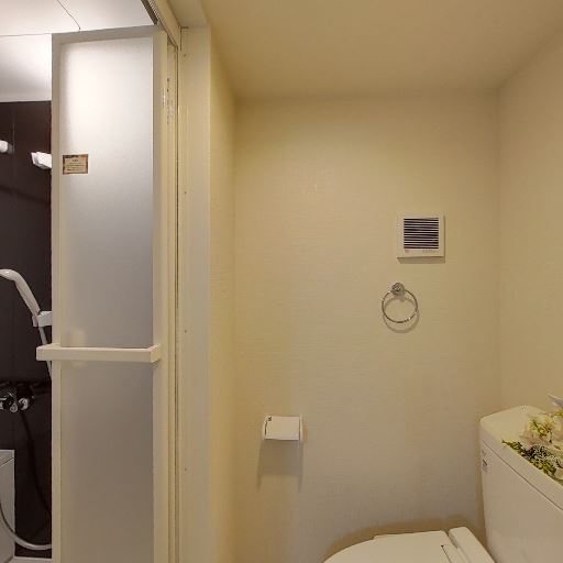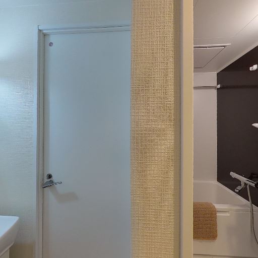 浴室が隣接し動線良好(確度82%):右側に浴室の出入口と浴槽・シャワーが見える。脱衣→入浴の動線が短い。