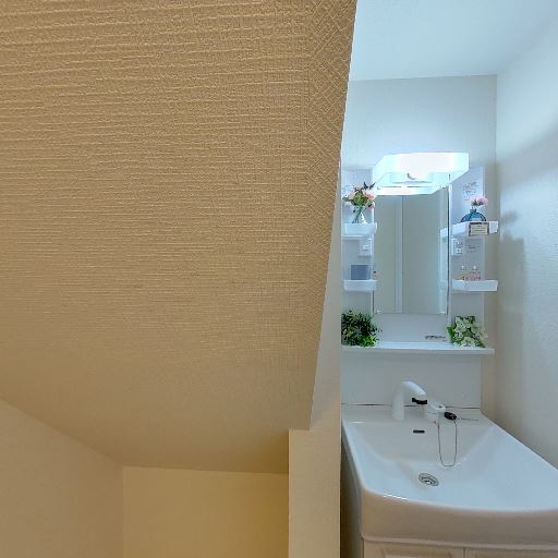 洗面台とミラー収納あり(確度86%):洗面ボウル一体型の小型洗面台と三面鏡キャビネット、両側にトレイ棚が確認できる。
