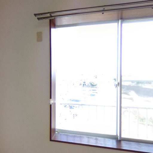 • 採光の良さ(確度90%):大きめの掃き出し窓から強い日差しが入り、室内が明るい。バルコニー手すりも見える。