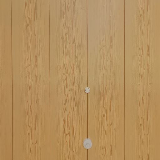 天井材の意匠と設備口(確度70%):木目調の天井に設備用の丸型カバーが2点見える。照明の設置は別途必要。