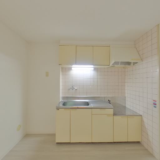 キッチンの状態(確度77%):シンプルな単身向けキッチンで、吊戸と換気扇、ステンレス天板が確認できる。年代はやや古めだが清潔に見える。