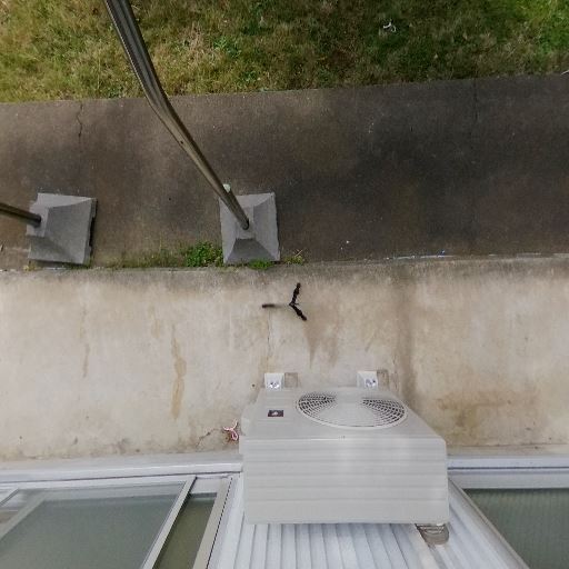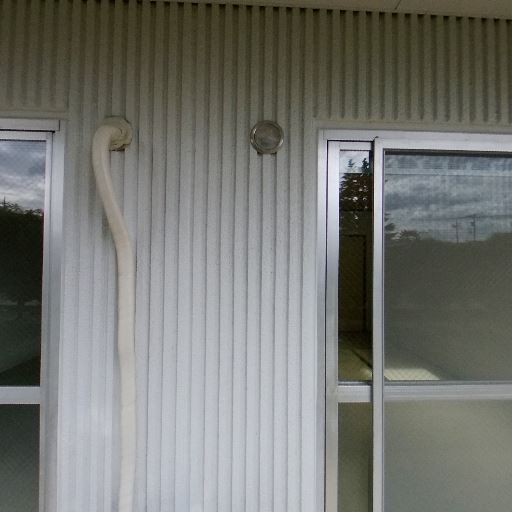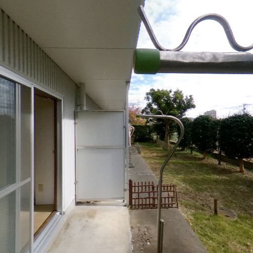 1階テラス・物干し設備あり(確度90%):掃き出し窓からコンクリート土間のテラスに出られ、物干し竿受けが設置されている。