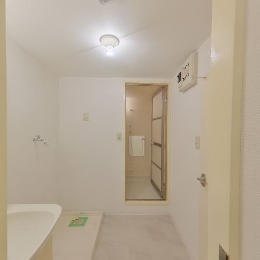 室内洗濯機置き場(確度90%):洗面室内に洗濯機パンと給水・排水口が見える。