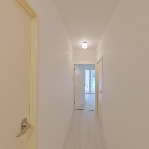 廊下の明るさと奥行き(確度80%):白基調の内装と天井照明で廊下が明るく、奥に居室へ続く直線的な導線が見える。