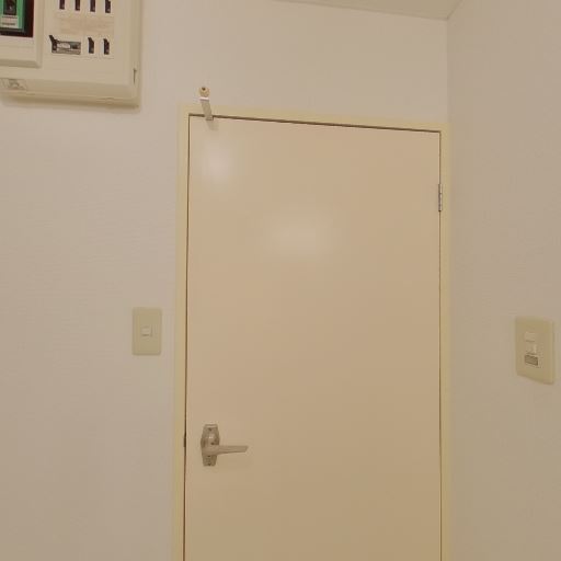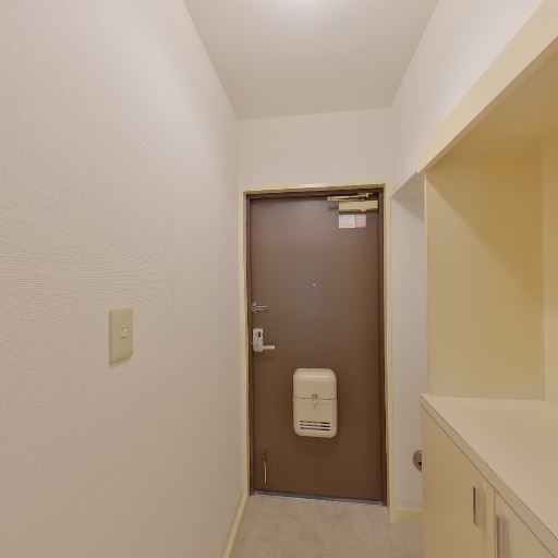 玄関周りの状態(確度77%):玄関ドアと周辺の壁・巾木が比較的きれいで、ドアに郵便受けやシューズボックスらしき収納が見える。