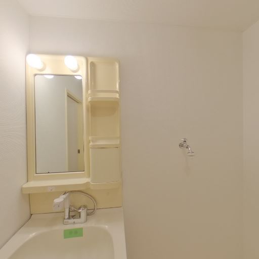 独立洗面台と収納付き(確度86%):鏡付きの独立洗面台があり、サイドに小物収納が複数備わっている。照明も内蔵されている。