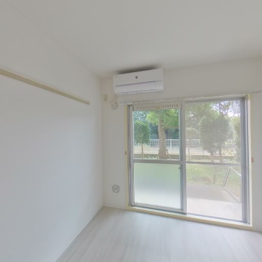 採光と眺望(確度86%):大きめの掃き出し窓から緑が見え、日中は十分な自然光が入っている。バルコニーも確認できる。