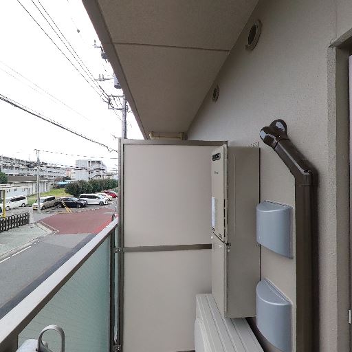 バルコニーの広さ(確度78%):エアコンの室外機が置かれても通路が確保できる程度の幅がある。手すりは不透明パネルで視線をある程度遮る。