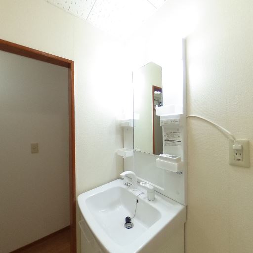 独立洗面台の設置(確度86%):扉の先に鏡・収納付きの独立洗面台が見える。