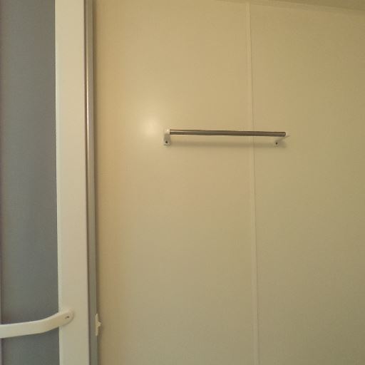 手すり・タオル掛けの備え付け(確度80%):出入口付近に手すり、壁にタオルバーが設置。