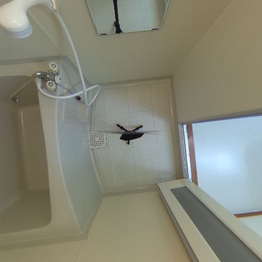 鏡とシャワー混合水栓(確度74%):洗い場に鏡とシャワー混合水栓がある。ホースシャワーで温度調整可能。