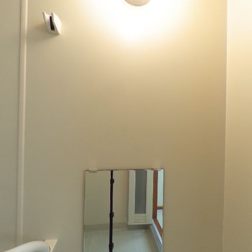 独立洗面台あり(確度90%):鏡付きの独立洗面台が設置されている。小物トレーや照明も備わる。