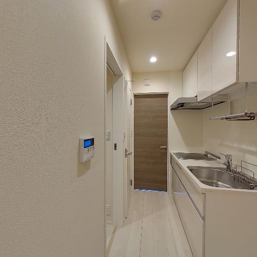 • 天井のダウンライトで照明は均一(確度88%):天井に複数のダウンライトがあり、廊下からキッチンまで必要な明るさは確保されているように見える。