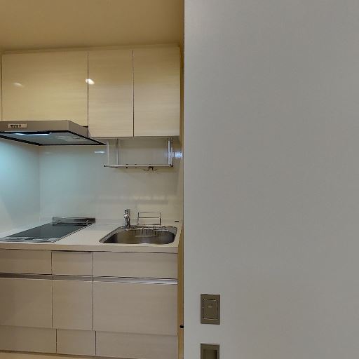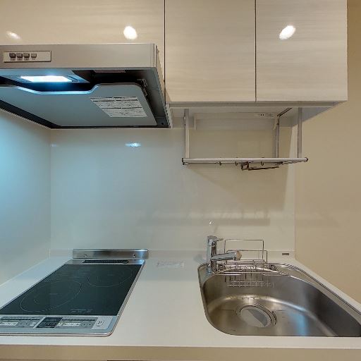 • キッチン設備がコンパクトにまとまっている(確度93%):IHコンロ、レンジフード、シンク、吊戸棚が一列に配置されており、単身者向けとして必要な設備が効率よく収まっている。