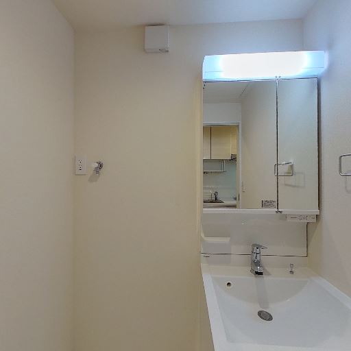 • 洗面台が新しく清潔感がある(確度89%):独立洗面台は白基調で、鏡まわりやボウル部分に目立つ劣化や汚れは見当たらない。三面鏡収納も備わっているように見える。