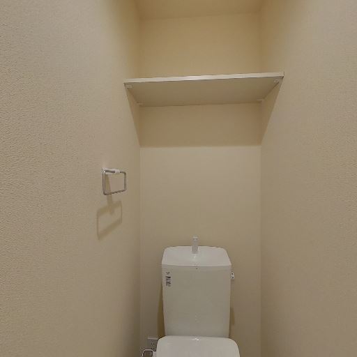 • 上部収納棚が設置されている(確度95%):トイレ正面上部に棚があり、トイレットペーパーや掃除用品の置き場として使えそうです。限られた空間でも収納を確保しています。