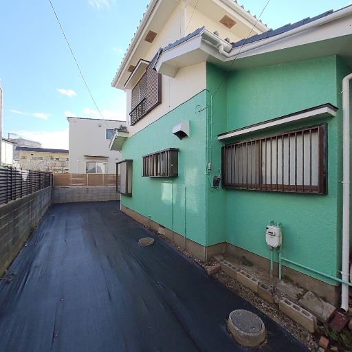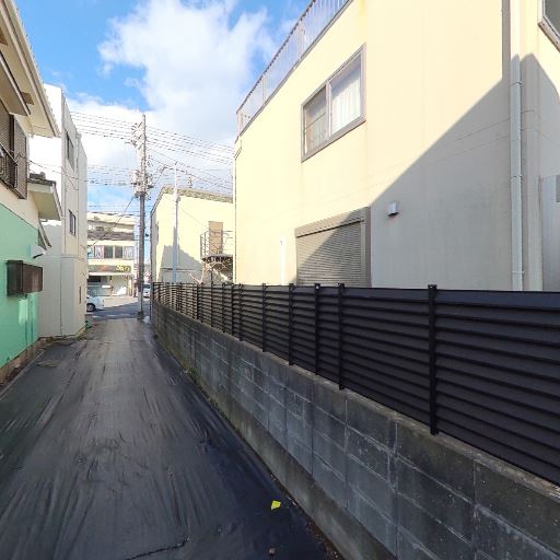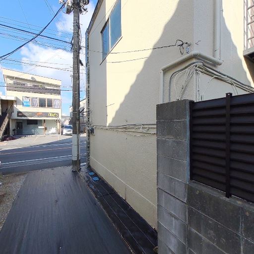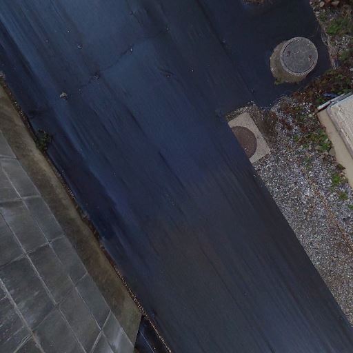 駐車・駐輪スペースの可能性(確度73%):建物横の通路が比較的広く、黒いシート敷きの地面とマンホールが見える。車の通行は厳しそうだが、バイクや自転車、物置の設置などには使えそう。