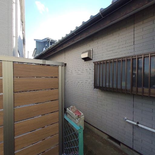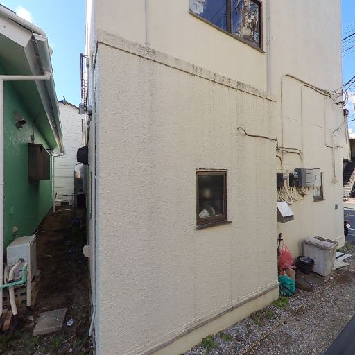 外壁・設備の状態(確度58%):隣接建物の外壁や雨樋、室外機が見える。大きな劣化は目立たないが、雨樋の勾配や苔・汚れの有無は近くで要確認。