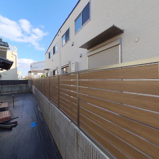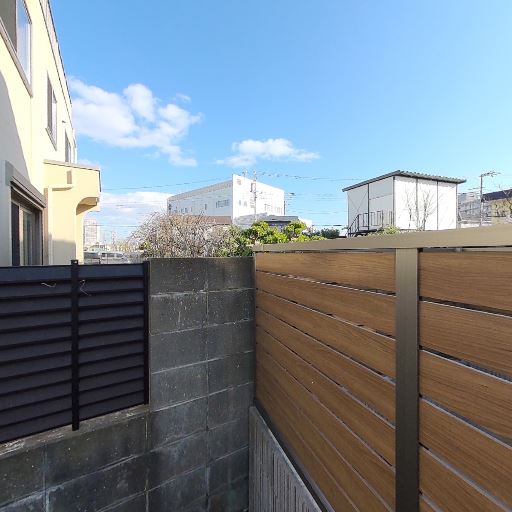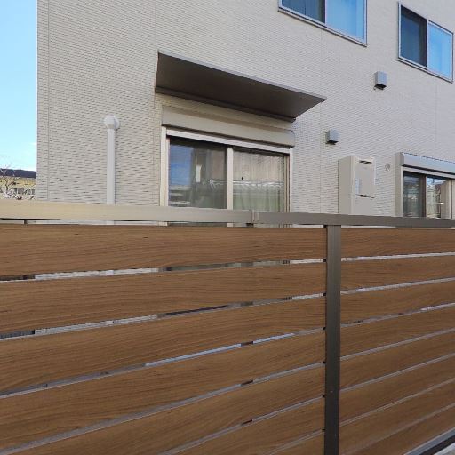 プライバシー確保(確度77%):木目調やルーバーの高いフェンスで周囲からの視線をある程度遮れている。