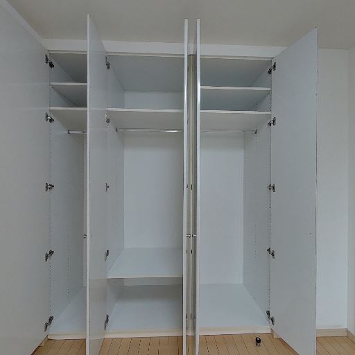 • 収納力の高いクローゼット(確度94%):壁面に大型のクローゼットがあり、上部棚とハンガーパイプが複数区画に分かれて設けられている。衣類や小物を整理しやすい構成に見える。