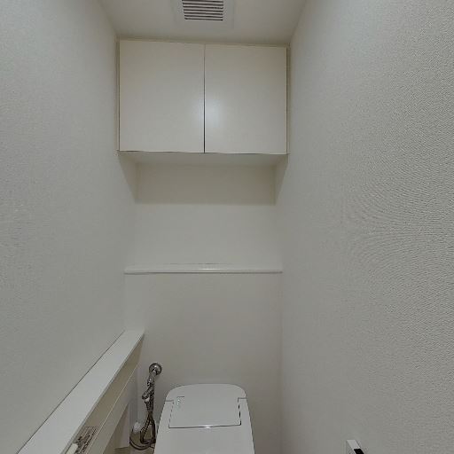 • 上部収納がある(確度95%):トイレ正面上部に扉付きの収納棚が設置されており、トイレットペーパーや掃除用品の保管に使えそうです。