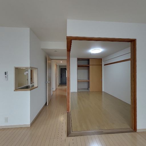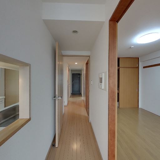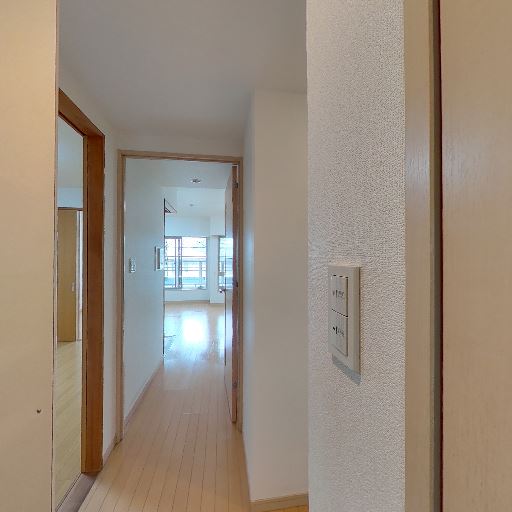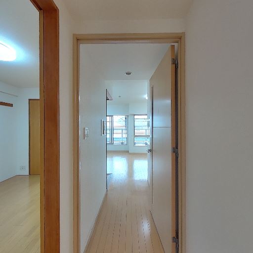 • 室内全体が明るめ(確度84%):奥の居室側に大きめの開口部が見え、廊下まで自然光が届いている。白い壁と明るい床材も相まって、空間全体が明るく見える。