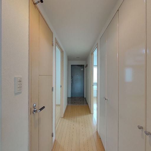 • 廊下まわりの収納が多い(確度91%):廊下の片側に背の高い扉付き収納が連続しており、玄関近くや居室周辺で日用品・掃除道具・衣類などを分けてしまえる可能性が高い。