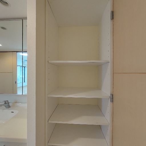 • 収納棚があり日用品を整理しやすい(確度94%):可動棚付きの収納が洗面スペース脇に設けられており、タオルや洗剤、ストック品の整理に使いやすそうである。